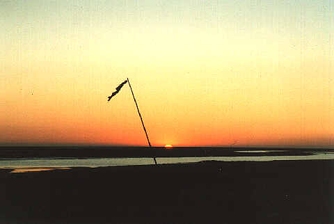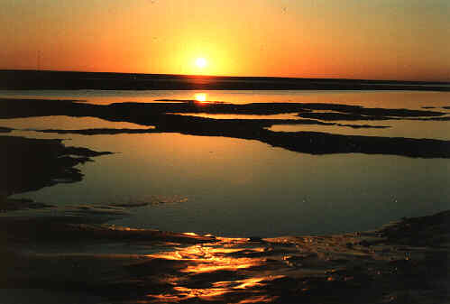 Abends, wenn sich die Hitze ein wenig gelegt hat, und alles in die Restaurants und Kneipen stroemt, kann man am einsamen Strand von St. Peter-Ording die wunderschoensten Sonnenuntergaenge knipsen. Hier ist ein solcher zu sehen. Zentimeter fuer Zentimeter "bewegt" sich die Sonne hinter die bei Ebbe freigelegten Landmassen. In der Gegend von St. Peter-Ording lassen sich solche Bilder sowieso sehr einfach und oft aufnehmen, denn der Strand ist genau nach Westen gerichtet, und auf mehreren Kilometern Laenge und Breite (!) kommt einem keiner in die Quere, aeh Linse... :-) |